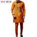 The men’s outfit completes the look with a stylish kaftan-style shirt detailed with matching African print accents, paired with comfortable tailored pants. The kaftan design offers an elevated, dignified appearance—perfect for wedding ceremonies and formal celebrations.