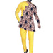The outfit features a custom-designed patchwork top, meticulously crafted with colorful African-inspired patterns that symbolize unity, heritage, and pride. Each panel of fabric is hand-stitched to ensure precision and durability, reflecting the skill of master tailors. The pure yellow pants add a radiant contrast, bringing warmth and sophistication to the overall look.